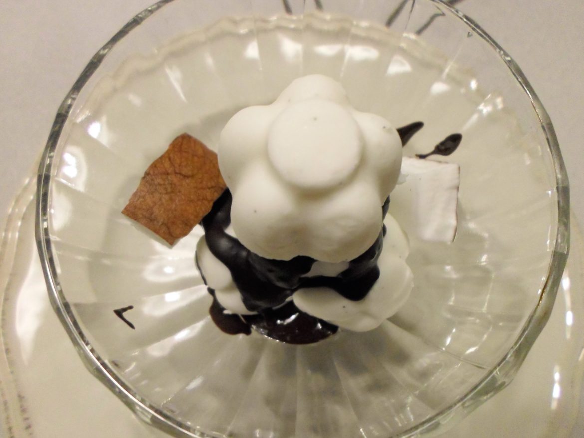 - Verdeel de ijsjes over 4 dessertglazen, giet de chocolade eroverheen. En serveer met een kokosnoot partje.