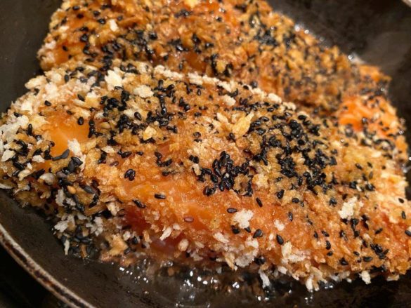 - En druk de zalmmoten op beide zijden in de breadcrumbs en sesamzaadjes mix;