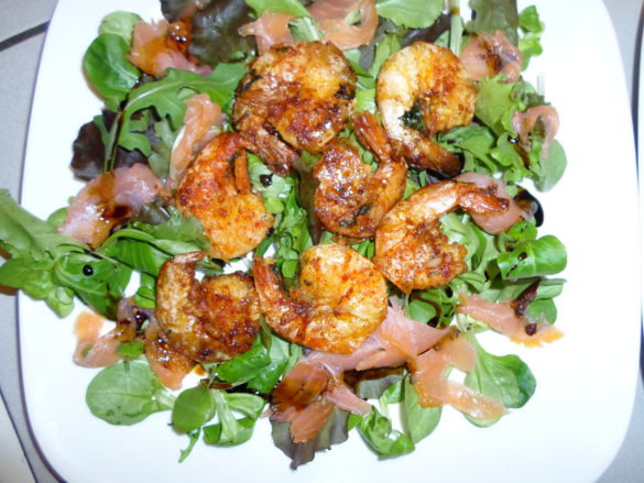 - Nadat de gamba’s goudbruin zijn, serveer het dan op een bedje van veldsla en rucola met plukjes gerookte zalm erdoor.