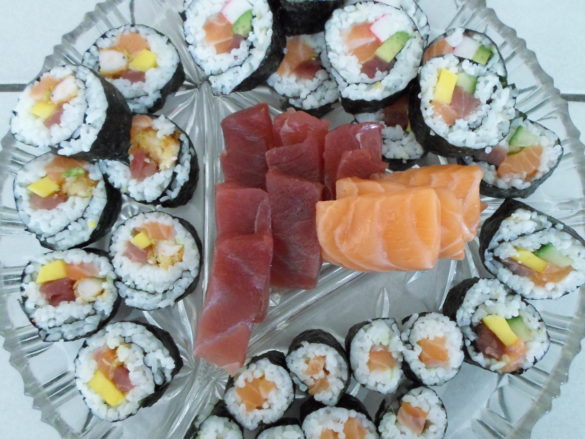 Homemade sushi en sashimi (rauwe plakjes vis). Heerlijk deze Japanse hapjes. Mijn man en ik kopen de boterzachte en verse zalm- en tonijnmoten op de Haagse vismarkt. We gaan dan gezellig thuis aan de slag met onze sushi creaties.