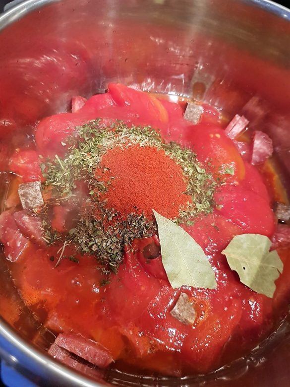 Doe de tomaten erbij, de gesneden kipcervelaat, kipgehakt, de oregano, peterselie, rozemarijn, tijm, paprikapoeder, laurierbladen en bouillonblokjes;