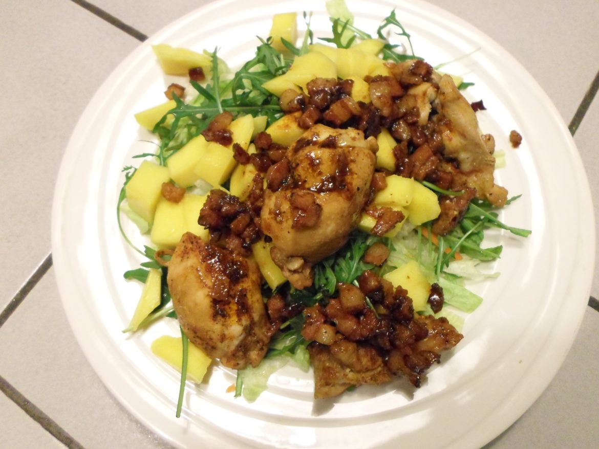 • Leg een grote handvol rucola eikenbladsla melange op een bord, leg de champignons met een eetlepel dressing erop (uit de pan waarin je de champignons hebt gebakken), doe de stukjes kip, mango en granaatappelpitjes erop, zoals op de foto.