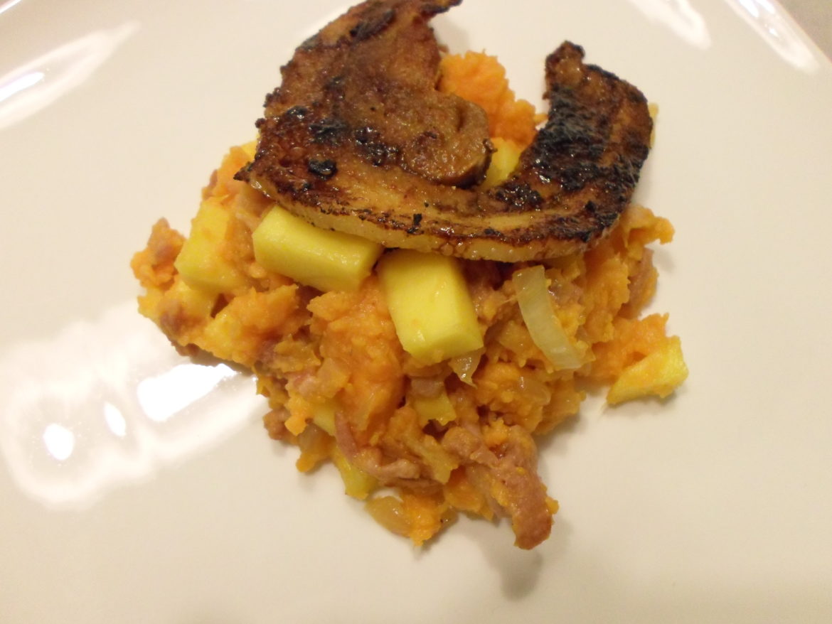 - Doe een schep van de zoete aardappelstamppot samen met een speklapje op een bord en eet smakelijk!!