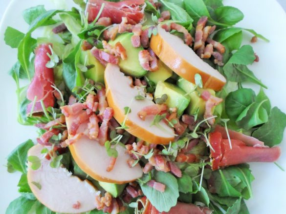 - Verdeel de gerookte kipfilet, wasabi rucola, uitgebakken spekreepjes, de Jamon serrano, en de avocado’s over de twee borden.